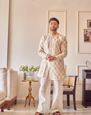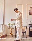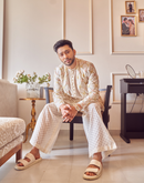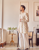JAAL EMBROIDERED JACKET + CHANDERI OPEN STYLE SHORT KURTA + FLARED PANTS