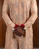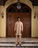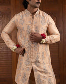 Almond tussar silk open styled potli buttoned kurta with floral kasab dori and zardozi work with almond tussar silk flared pant