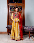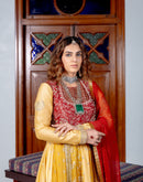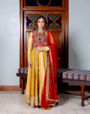 Canary yellow and dark rose Anarkali with brocade, sequin, heart zardozi motifs and sequin butti pannels paired with dark rose zardozi and kasab jaal work koti and chiffon badla work and kiran edges dupatta