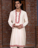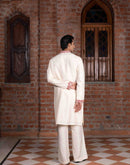 Ivory tussar silk kurta with rust thread and mirror work with ivory tussar silk flared pants