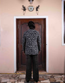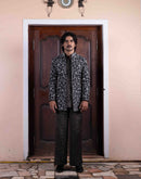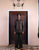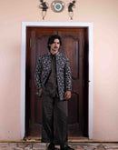 Jade tussar silk jacket with floral kasab and zardozi jaal work paired with textured tissue potli button shirt and flared pant