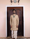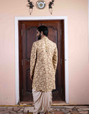 Pecan pie tussar silk sherwani with vine inspired dori and zardozi embroidery paired with ivory bemberg satin dhoti