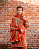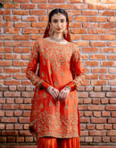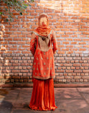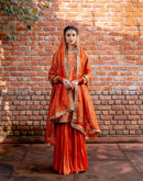 Rust tussar silk kurta with resham and kasab dori work paired with silk organza garara and textured tissue sequin and kiran edges dupatta