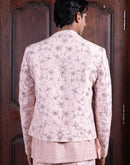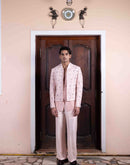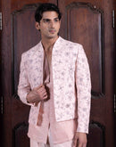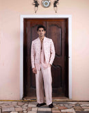 Salmon pink tussar silk jacket with resham, kasab and mirror dori work paired with mettalic polka dotted chanderi shirt and tussar silk flared pant