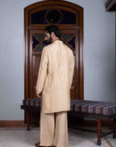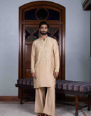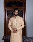 Sand tussar silk kurta with gold kasab and mirror work paired with sand tussar silk flared pant