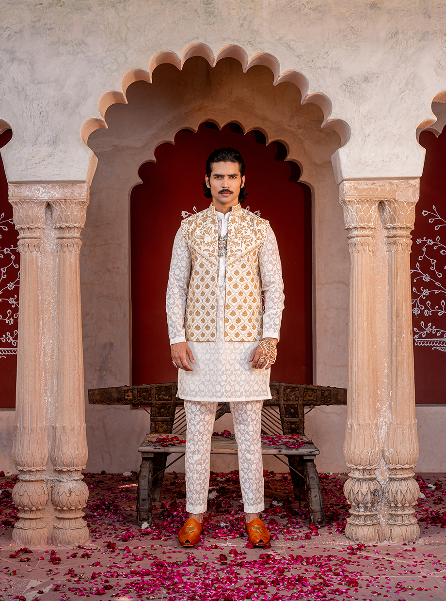 CHANDERI BROCADE KURTA SET PAIRED WITH CHANDERI MOLTEN GOLD KASAB DORI WORK BUNDI