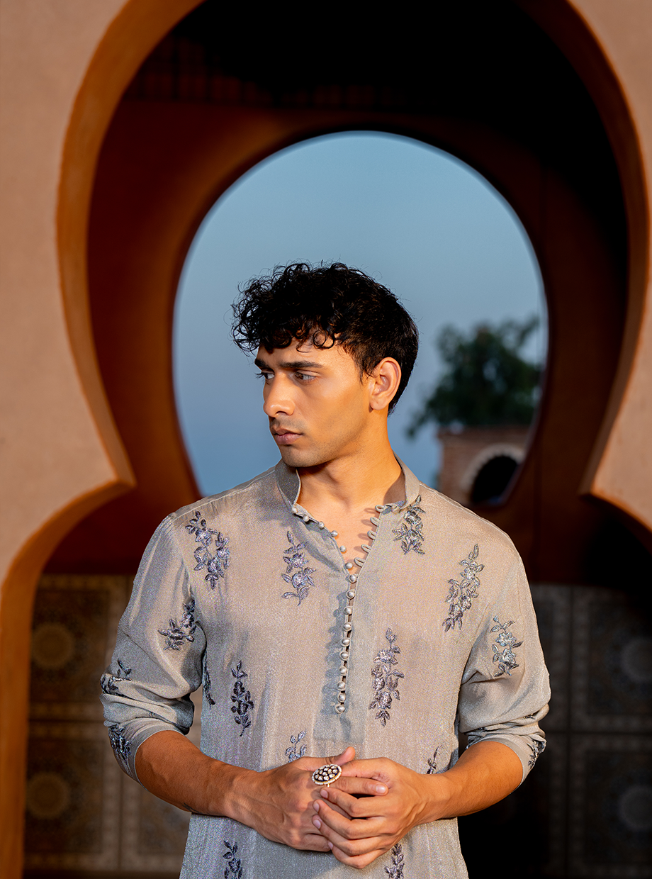GREY SHIMMER KURTA EXAGGERATED WITH TONE ON TONE KASAB DORI FLORAL EMBROIDERY PAIRED WITH CHANDERI PANTS