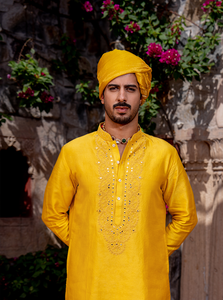 GENDA YELLOW CHANDERI KURTA SET ELBAORATED WITH RESHAM, KASAB DORI & MIRROR WORK WITH IVORY CHANDERI PANTS