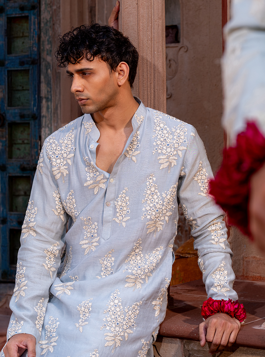 DUSTY BLUE CHANDERI FLORAL EMBROIDERED KURTA WITH IVORY CHANDERI PANTS