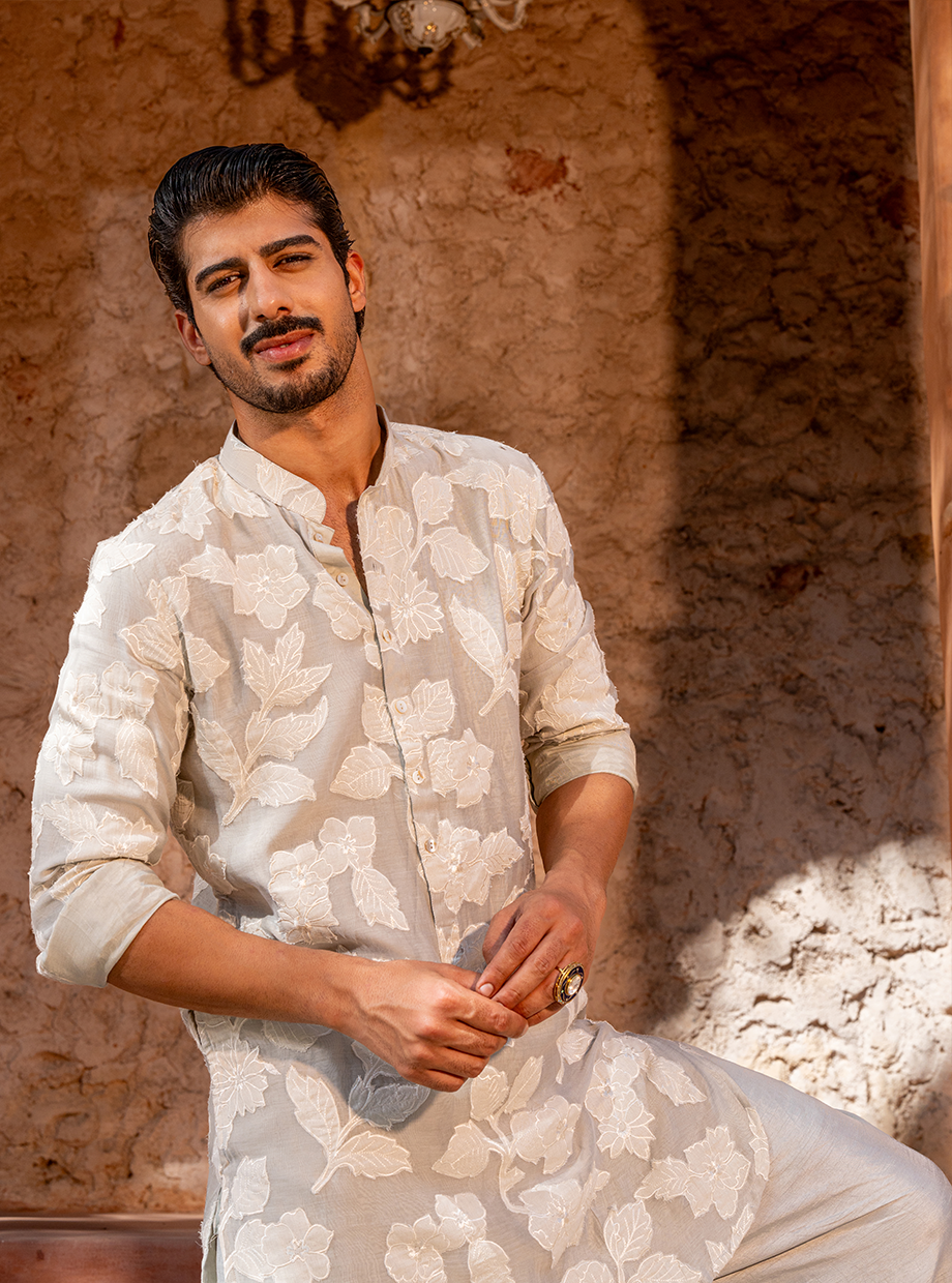 GREY CHANDERI KURTA WITH FLORAL APPLIQUE AND TUSSAR SILK WIDE LEGGED PANTS