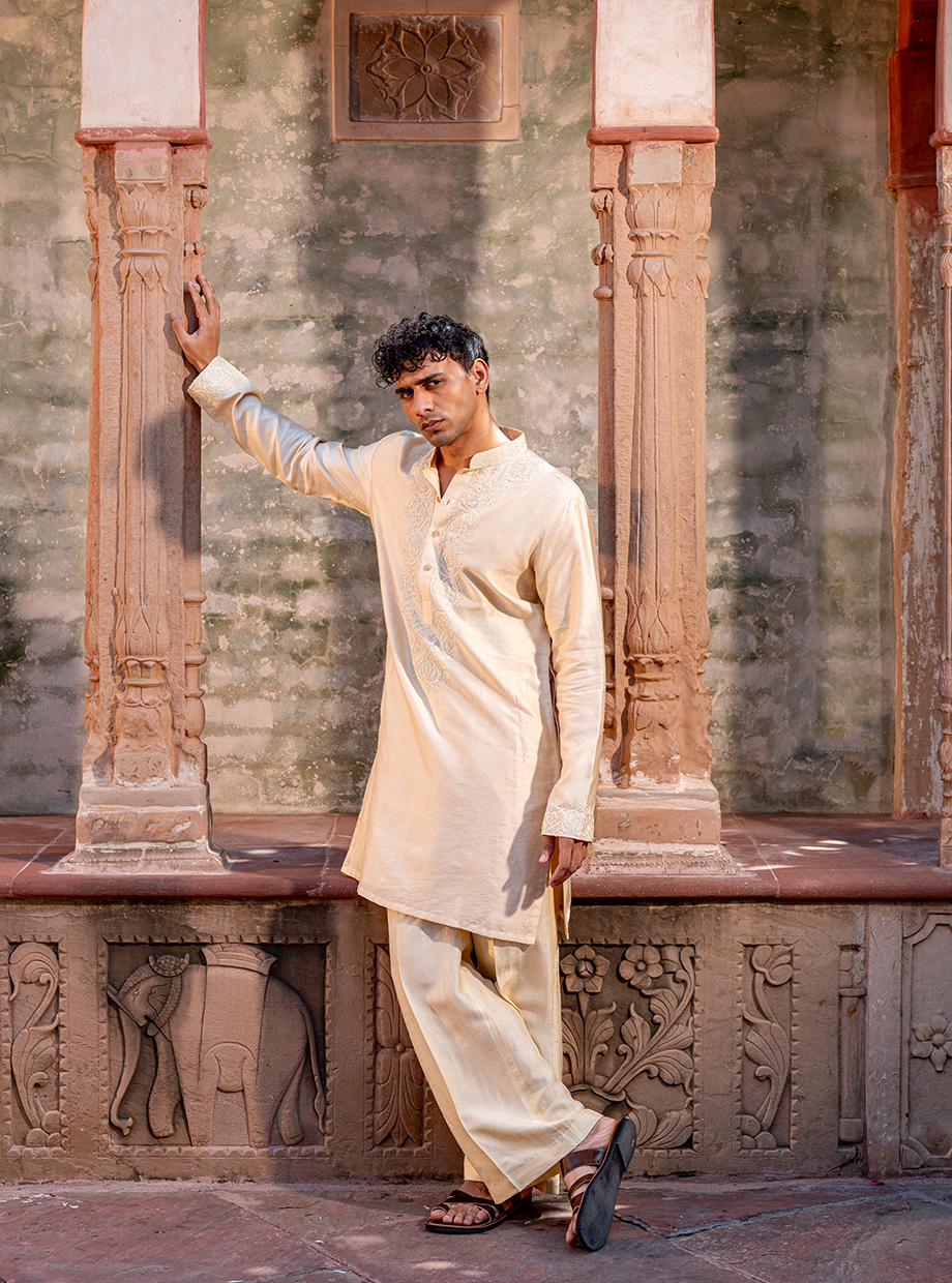 CREAME CHANDERI KURTA WITH KASAB AND RESHAM DORI WORK PAIRED WITH TUSSAR SILK FLARED PANT