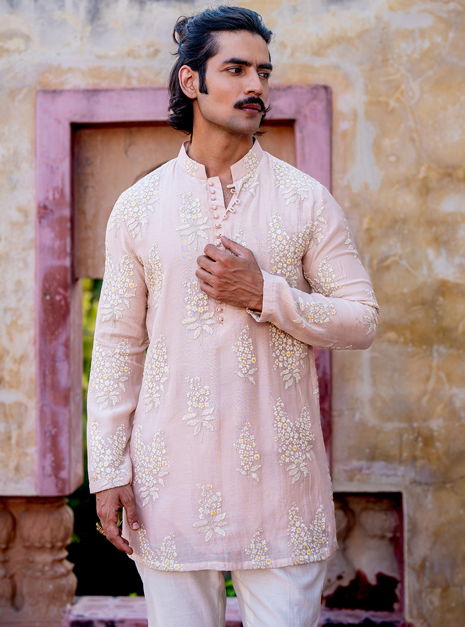 DUSTY PINK CHANDERI FLORAL EMBROIDERED LONG BUNDI WITH CHANDERI FLORAL EMBROIDERED KURTA PAIRED WITH SATIN LINEN PANT