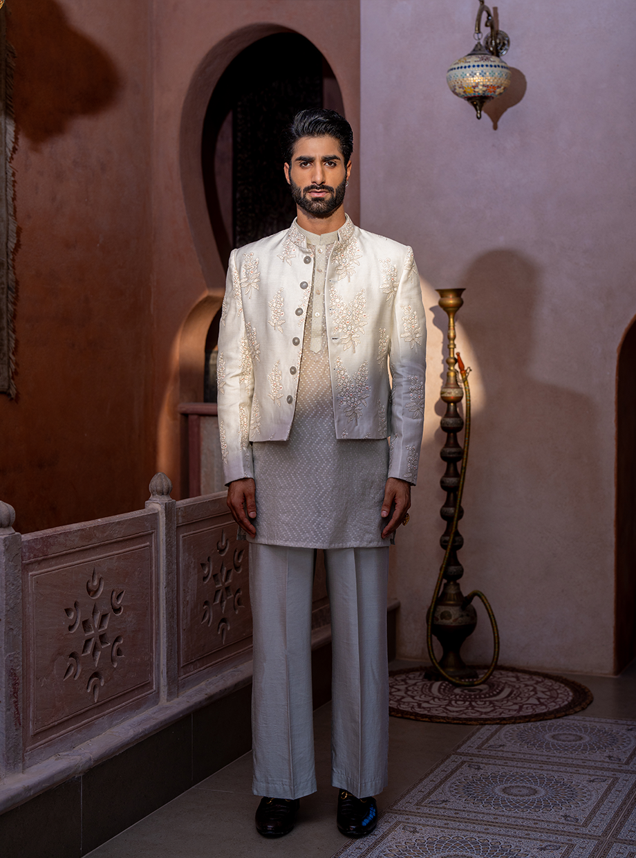 GREY FLORAL CROPPED JACKET PAIRED WITH GREY POLKA DOTTED CHANDERI KURTA + TUSSAR SILK PANT