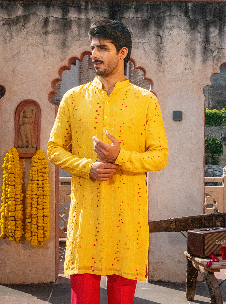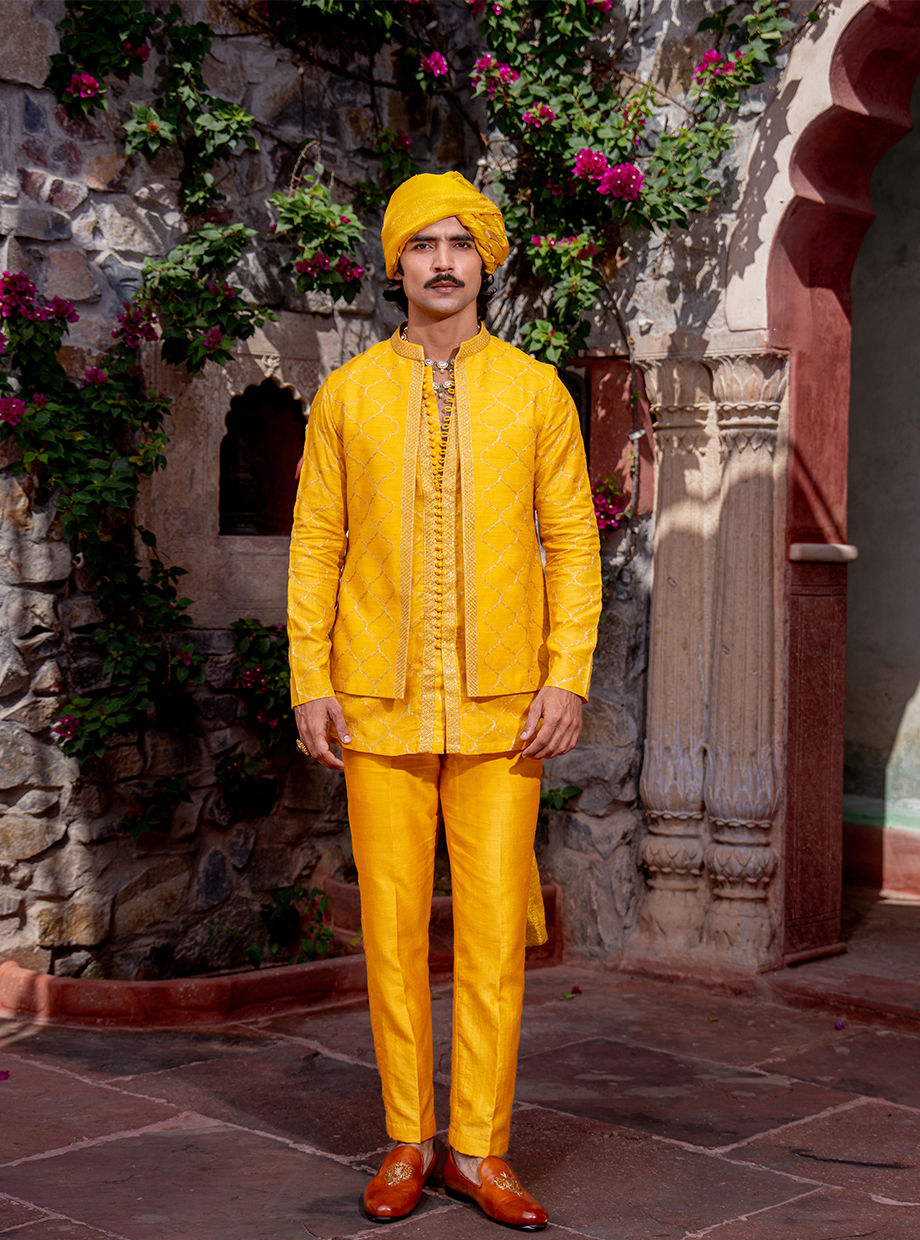 GENDA YELLOW CHANDERI KURTA & BUNDI ELABORATED WITH MUGHAL ZARI JAAL PAIRED WITH GENDA YELLOW CHANDERI PANTS