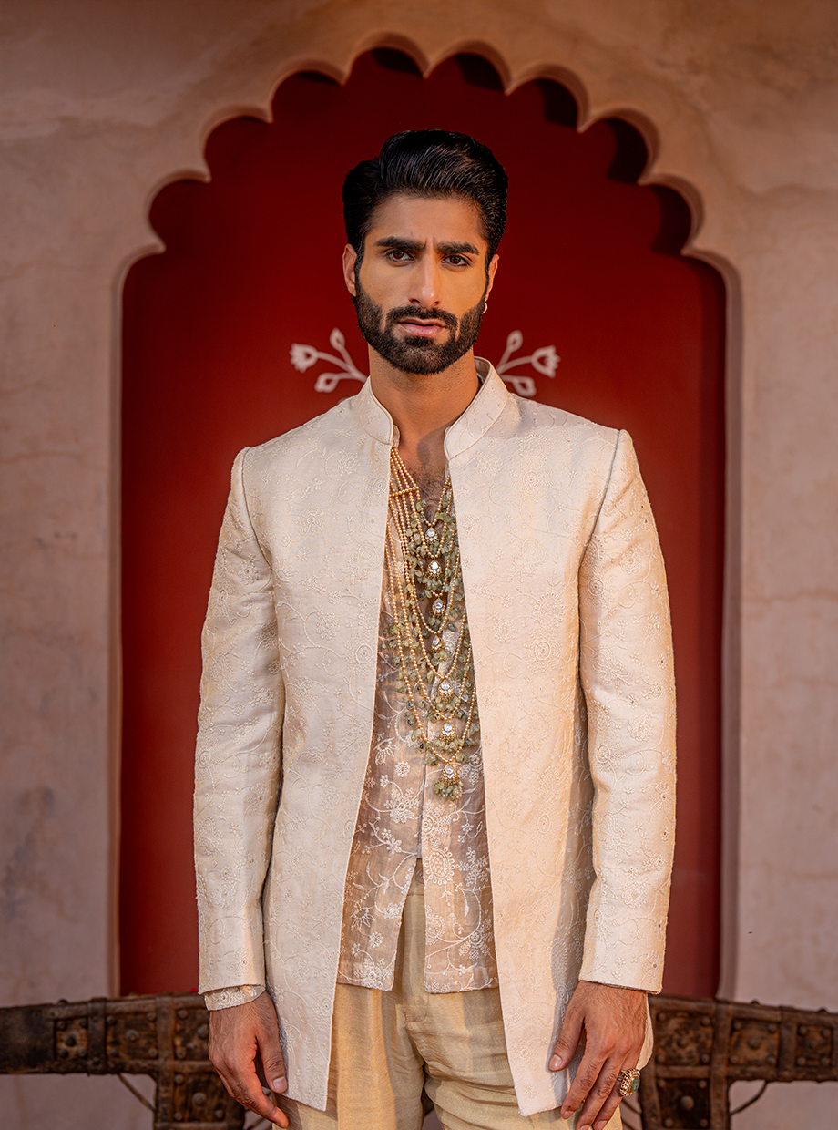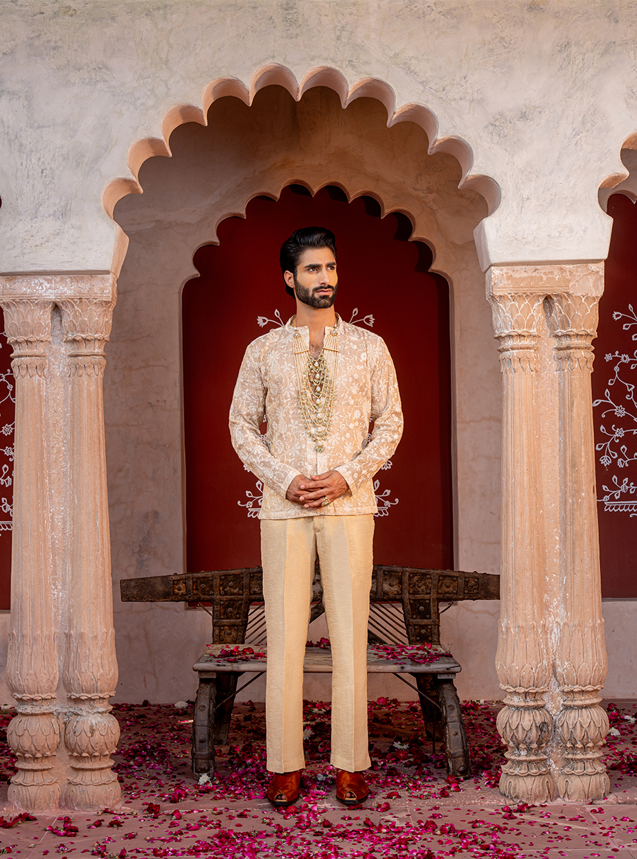 COFFEE CREAM CHANDERI JACKET WITH LUCKNOWI EMBROIDERY + SAME WORK SHEER SHIRT PAIRED WITH SATIN LINEN SHIMMER PANTS