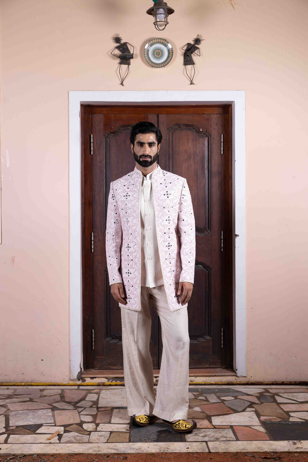 Soft pink tussar silk long jacket with mughal jali inspired resham, kasab and mirror work paired with ivory textured tissue sleeveless button bundi and flared pant