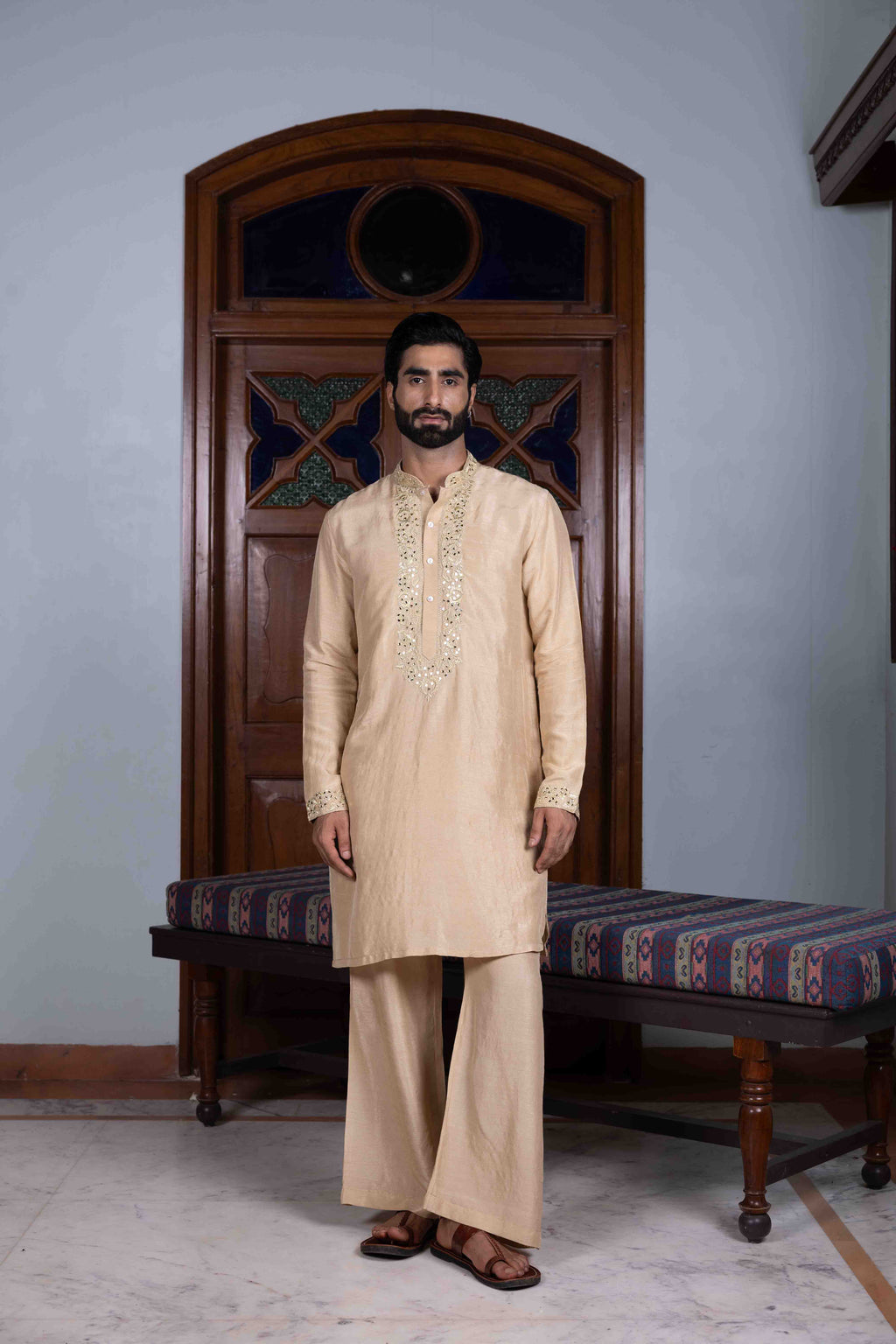 Sand tussar silk kurta with gold kasab and mirror work paired with sand tussar silk flared pant