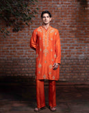 Rust tussar silk kurta with resham, kasab dori and mirror work with rust tussar silk flared pant