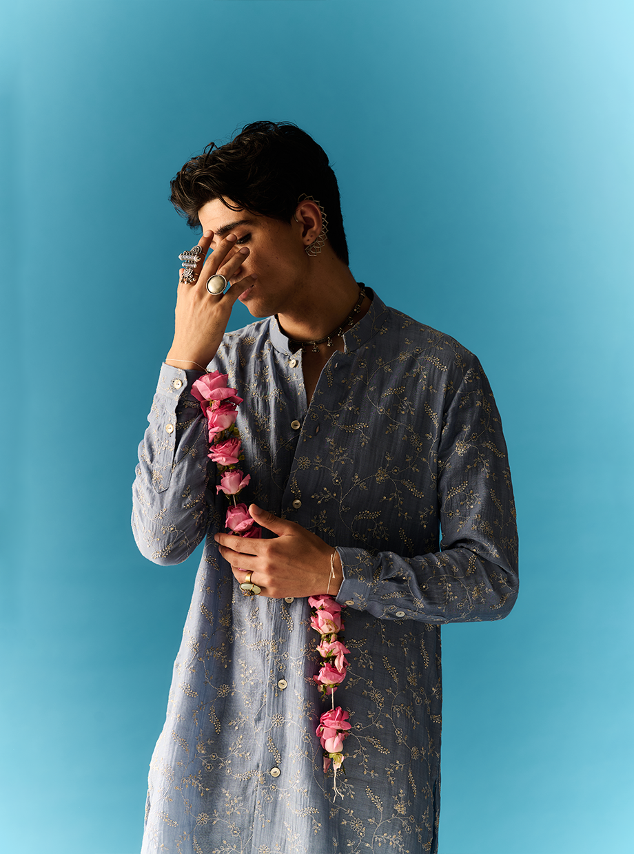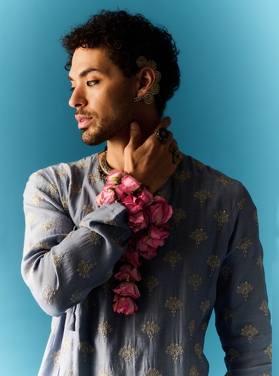 AZURE BLUE OPEN STYLE KURTA SET ELABORATED WITH ZARI AND TIKKIFLORAL EMBROIDERY PAIRED WITH CHANDERI PANT style code: NN - 10