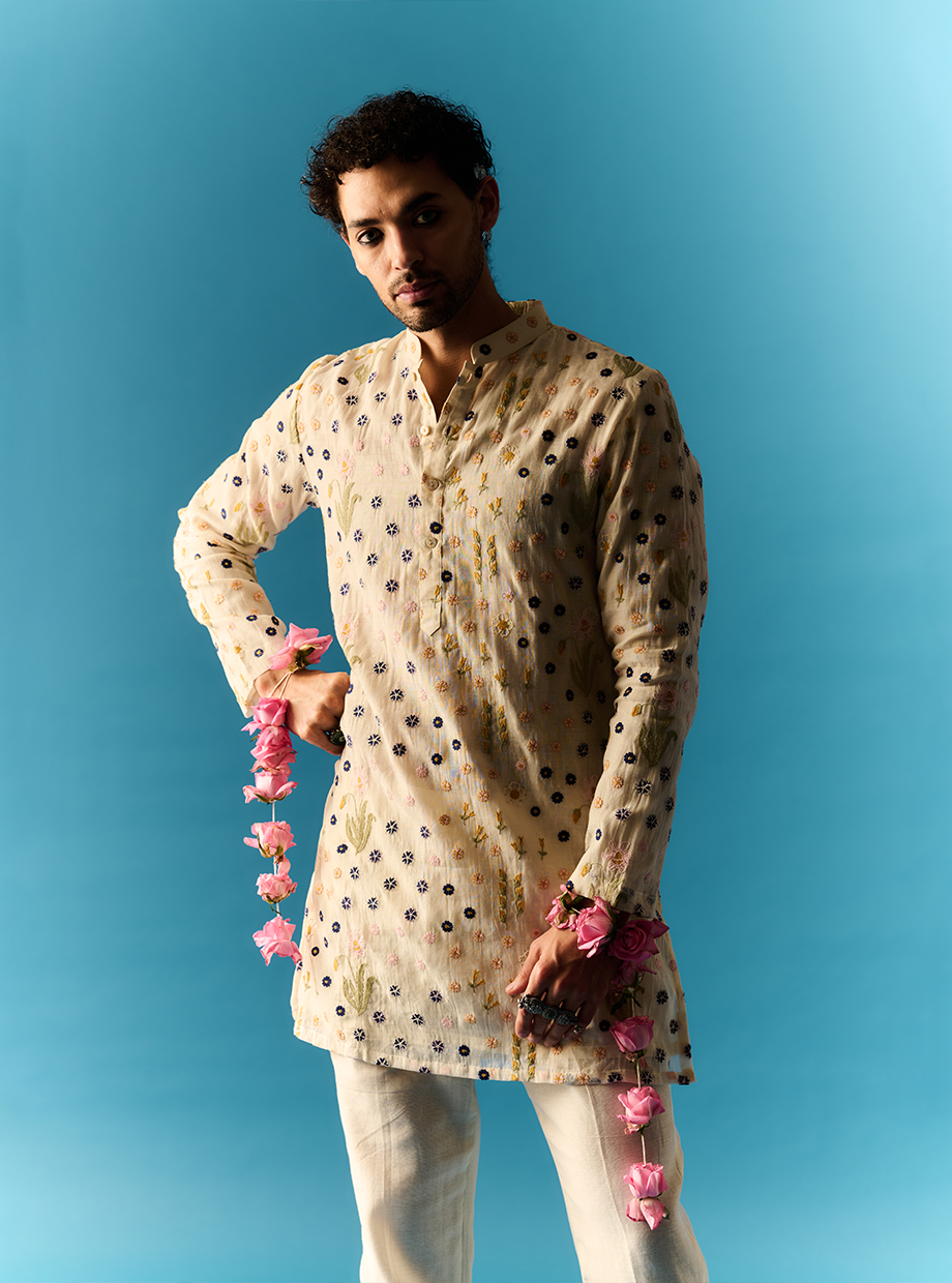 IVORY CHANDERI SHORT KURTA SET ELABORATED WITH ROSE EMBROIDERYAND BADLA EMBELLISHMENT PAIRED WITH A CHANDERI PANT style code: NN - 19