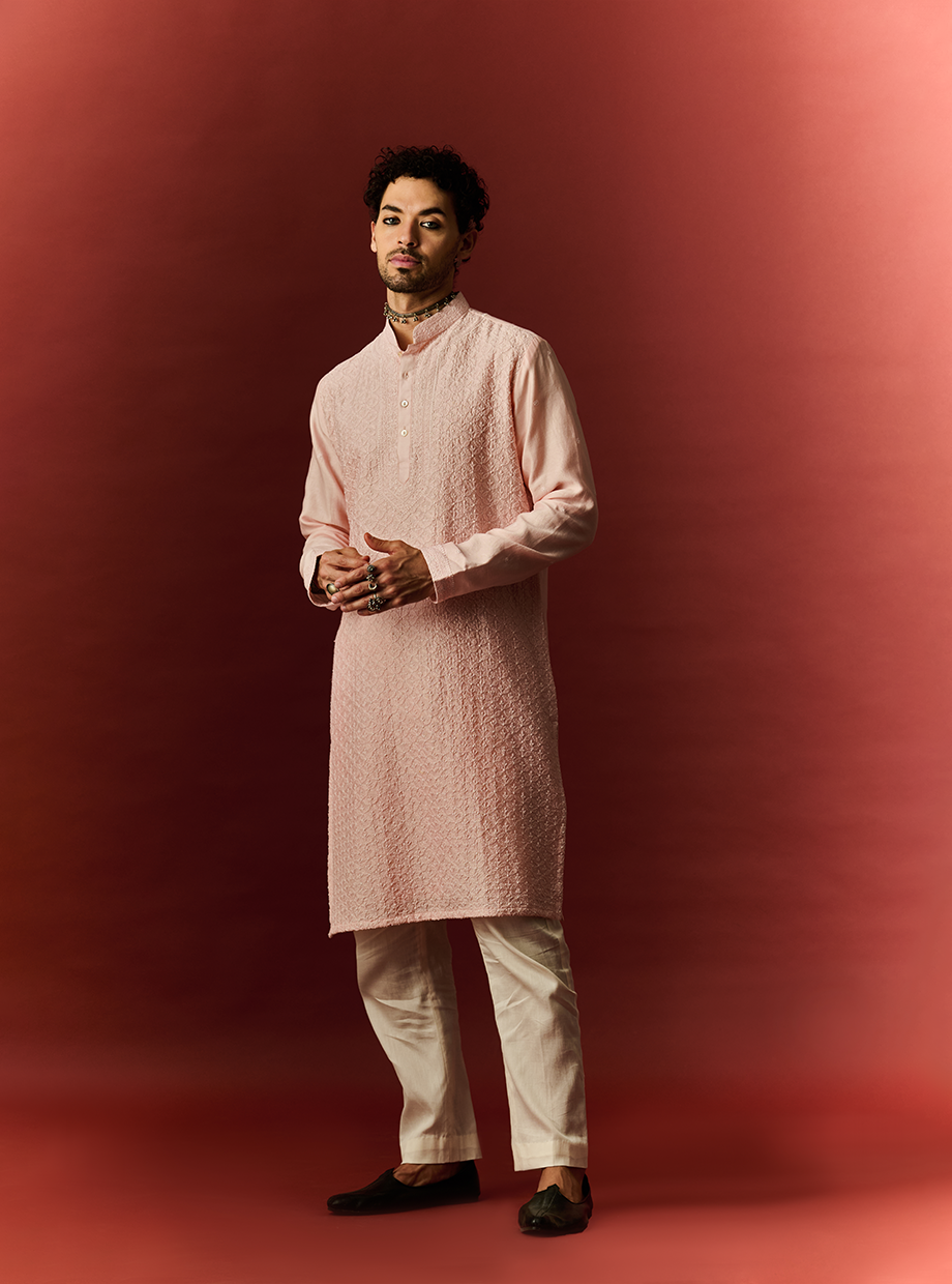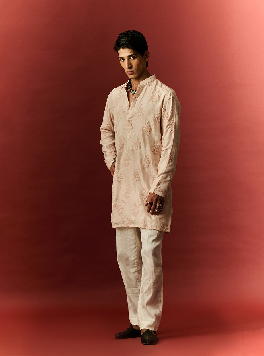 LUCKNOWI WORK CRAYOLA PEACH SILK KURTA style code: NN - 21