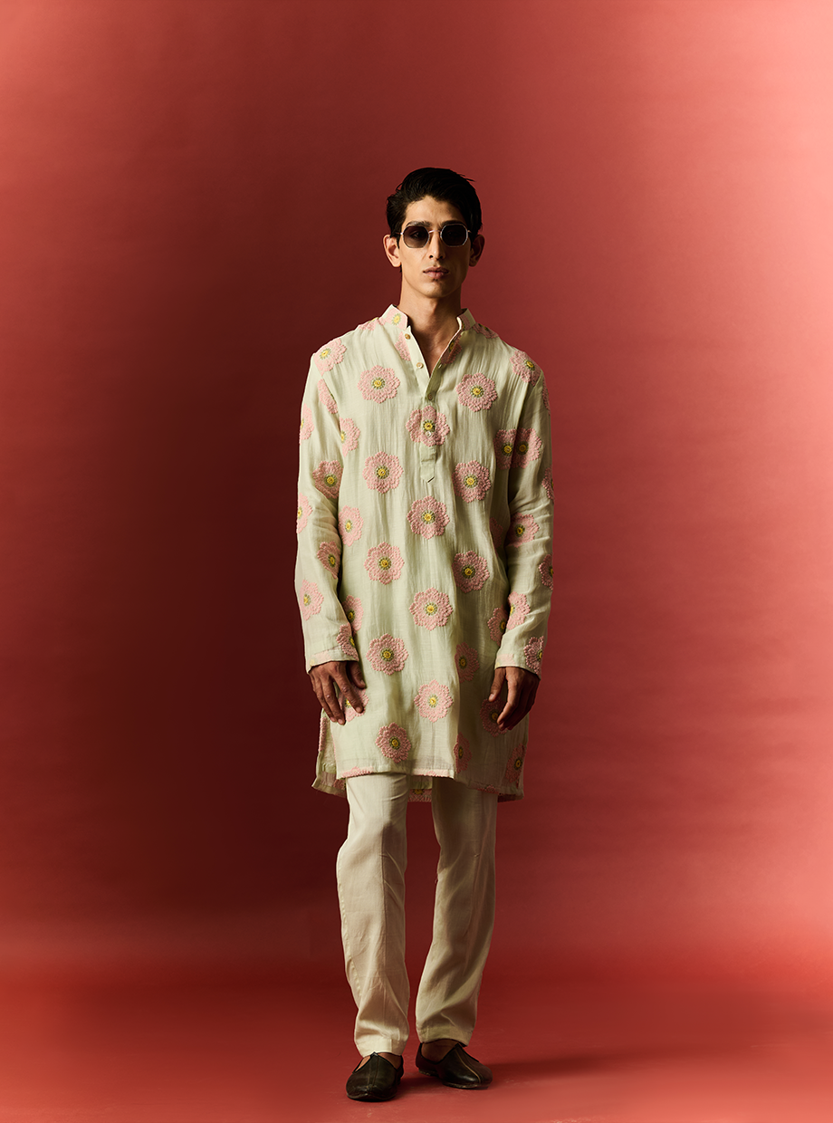 MINT CHANDERI KURTA SET ELABORATED WITH FLORAL EMBROIDERY PAIREDWITH A MINT GLAZE COTTON PANT style code: NN - 16