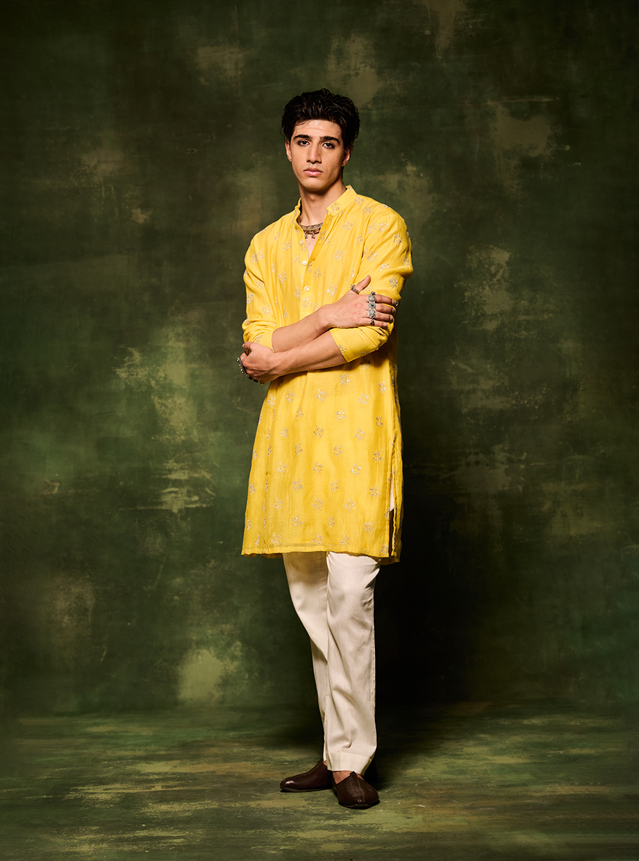 YOLK YELLOW CHANDERI KURTA SET ELBAORATED WITH ZARI & TIKKIEMBROIDERY PAIRED WITH WHITE COTTON GLAZE PANT style code: NN - 02