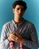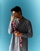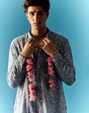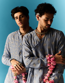 AZURE BLUE OPEN STYLE KURTA SET ELABORATED WITH ZARI AND TIKKI FLORAL EMBROIDERY PAIRED WITH CHANDERI PANT