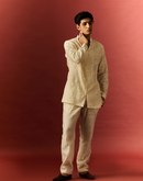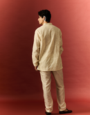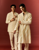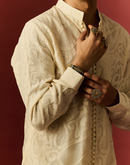 IVORY CHANDERI JACKET STYLE SHORT KURTA SET WITH APPLIQUE DETAILING AND PEAL BUTTONS PAIRED WITH CHANDERI PANTS