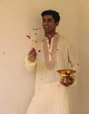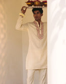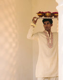 COTTON WITH GOLD LUREX KURTA EXAGGERATED WITH ROSE HAND EMBROIDERED ZARDOZI STYLED WITH A DOTTED COTTON PANT
